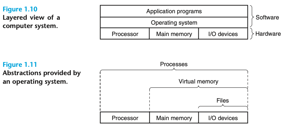 hello 프로그램을 로드하고 실행했을 때와 hello 프로그램이 메시지를 출력할 때, 프로그램이 키보드나 디스플레이, 디스크나 메인 메모리를 직접 액세스 하지 않았다. 오히려 운영체제 Operation System가 제공하는 서비스를 활용한다. 운영체제는 하드웨어와 소프트웨어 사이에 위치한 소프트웨어 계층으로 생각할 수 있다.