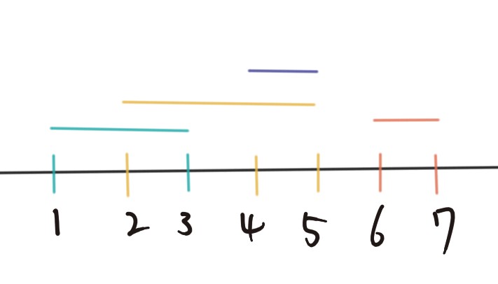 - 선들이 일부 겹치는 경우 : 비교하고 있는 선이 최초 설정한 선과 비교했을 때 시작점이 포함이 되나 끝 점이 더 큰 경우 start는 유지하고 end 값을 더 큰 값으로 대체