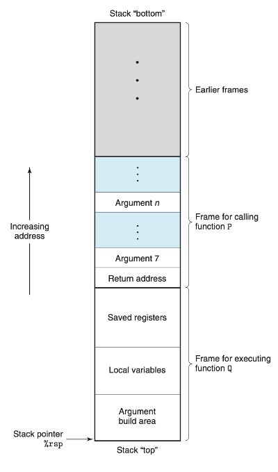 현재 실행 중인 함수의 스택 프레임은 항상 스택의 최상단에 위치한다. Q가 P에 의해 호출되면, P의 반환 주소가 스택에 저장되고, 그 위에 Q의 스택 프레임이 추가된다.