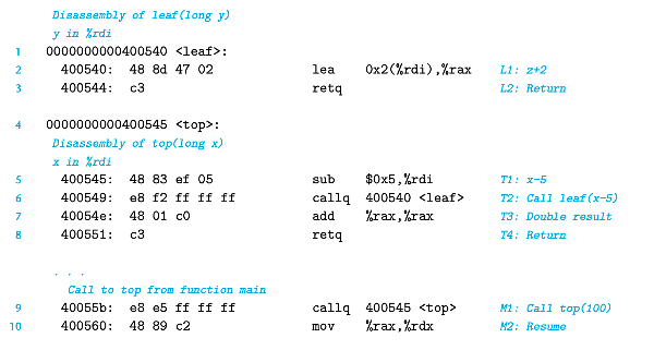 (a) 어셈블리 코드: main, top, leaf 함수