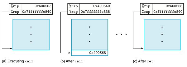 - call 명령어 실행 전: %rip는 call 명령어 위치, %rsp는 현재 스택 최상단