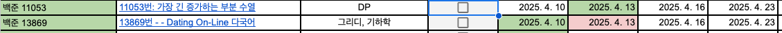 새로운 문제를 푸는 것도 중요하지만 무작정 많이 푼다고 되는 것은 아니라는 것을 아주 자~~알 알게 되었습니다. 워낙 AI가 우리 곁에 다가왔다 보니 고민하고 고민하다 도저히 안되면 어느새 GPT를 열고 있는 저를 발견했습니다. 그리고 물어보면 답이 나옵니다. 그리고 정답을 붙여 넣는 저를 발견할. 수 있었습니다. 이러면 안 된다는 것을 잘 알고 있지만 마치 Github에 잔디 심는 것처럼 그저 안 푼 문제 중에서 쉬운 문제로 하루에 1개를 풀었다고 백준에 잔디를 심는 것은 잘못됐다고 인지했고 그럼 어떻게 해야 할까? 하다가 반복을 통해 코테에 주로 많이 나오는 문제 유형을 주기적으로 반복해서 학습을 해야겠다고 생각했고 그런 문제들이 너무 많으니 한 번에 정리했다가 문제를 해결한 날과 다시 복습해야 하는 날을 파악할 수 있으면 좋겠다 생각했습니다.