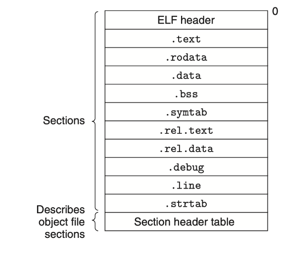 객체 파일은 여러 섹션(section)으로 구성되며, 대표적인 것들은 다음과 같다.