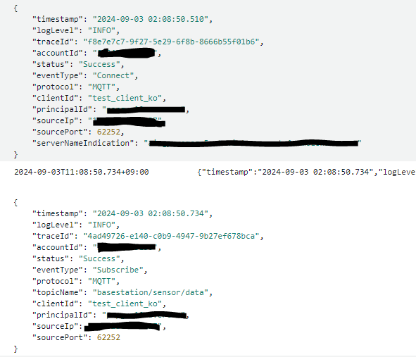 AWS IoT Core로 해당 사용자에 대한 정책을 추가하여 연결을 허용하게 된다. 다음으로는 AWS IoT Core의 로그도 확인하겠다.