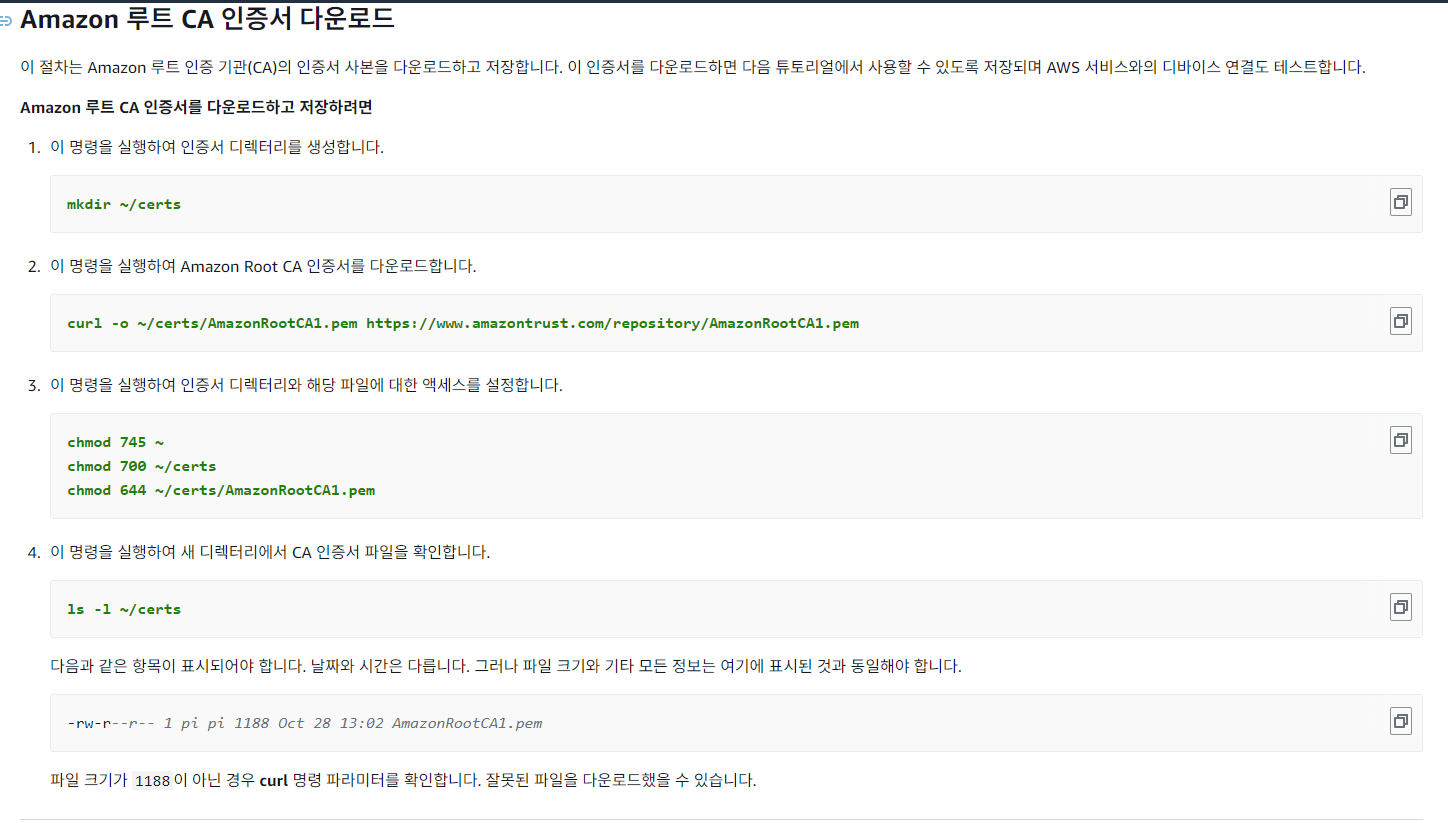 위의 AWS IoT Core 개발자 안내서에서 AmazonRootCA1.pem 파일을 다운받을 수 있다.