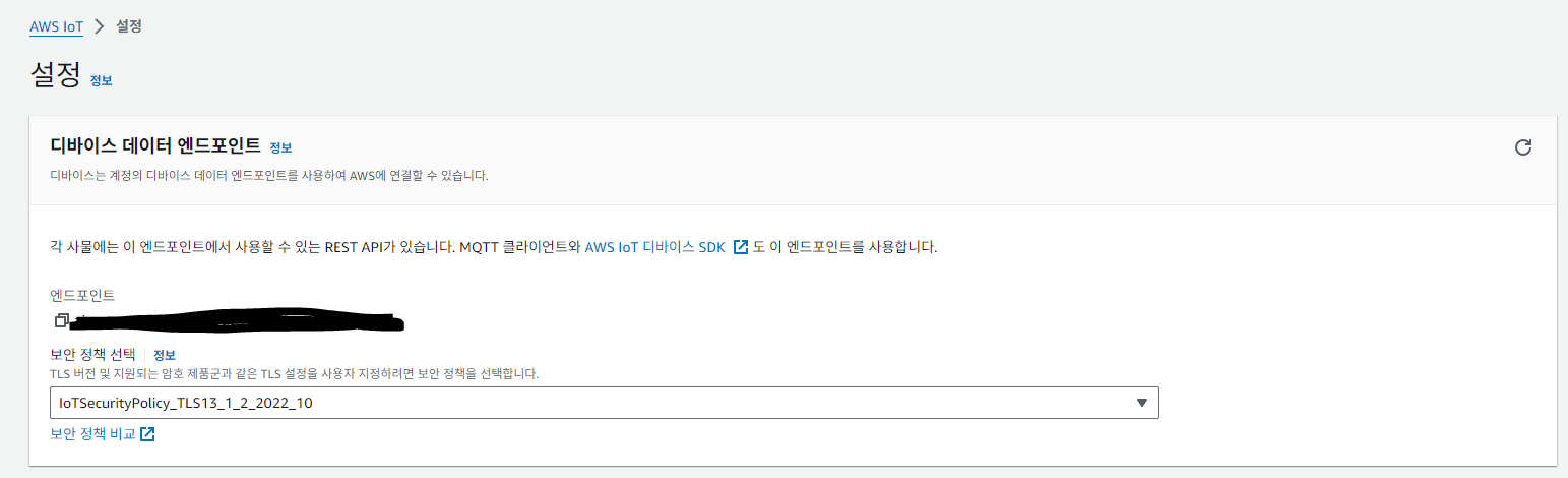 AWS IoT Core 엔드포인트는 AWS IoT Core 콘솔에 설정에서 확인할 수 있다.